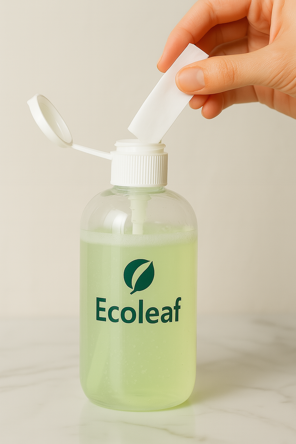 1. Place deux feuilles Ecoleaf dans un flacon‑pompe. 2 Feuilles = 100ml